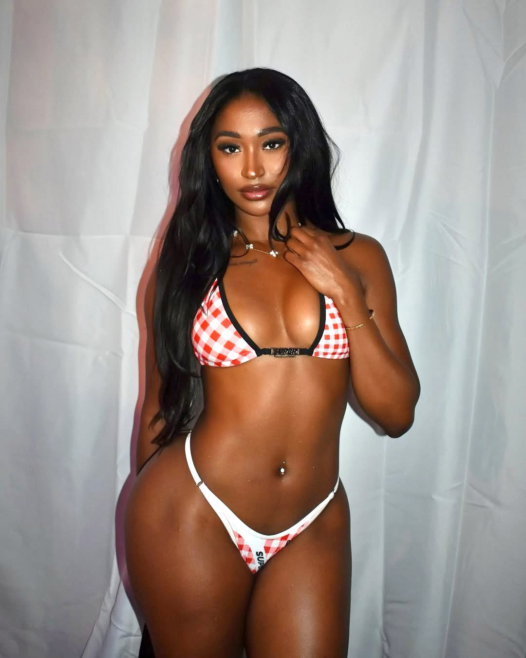 Wearing Gingham Red Bikini.